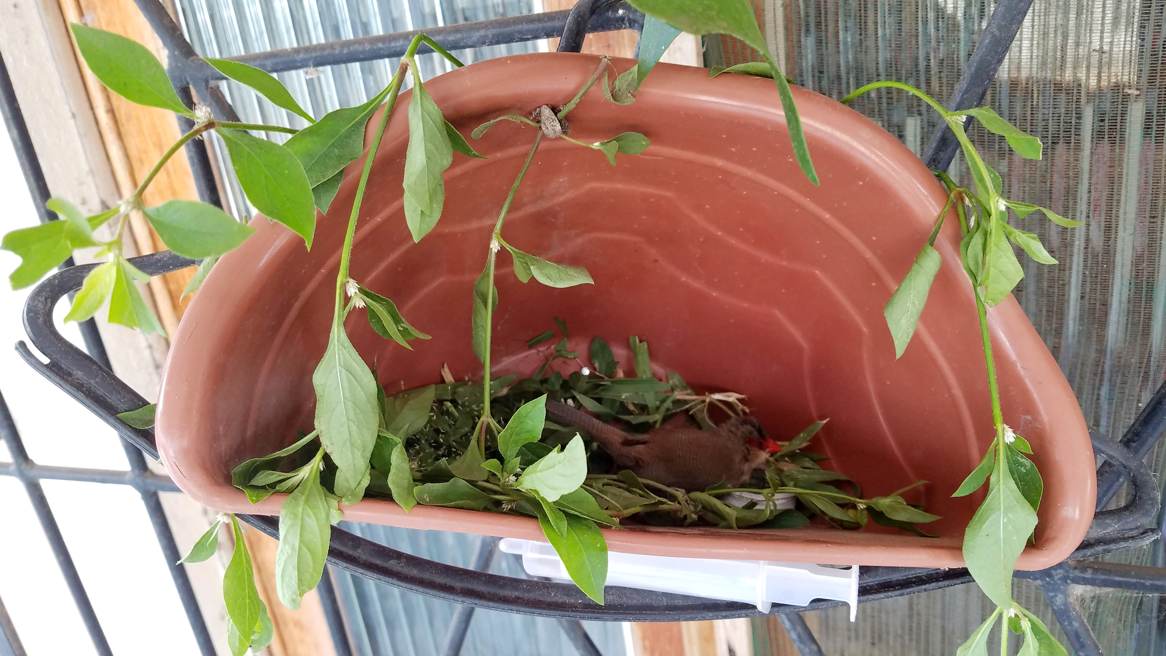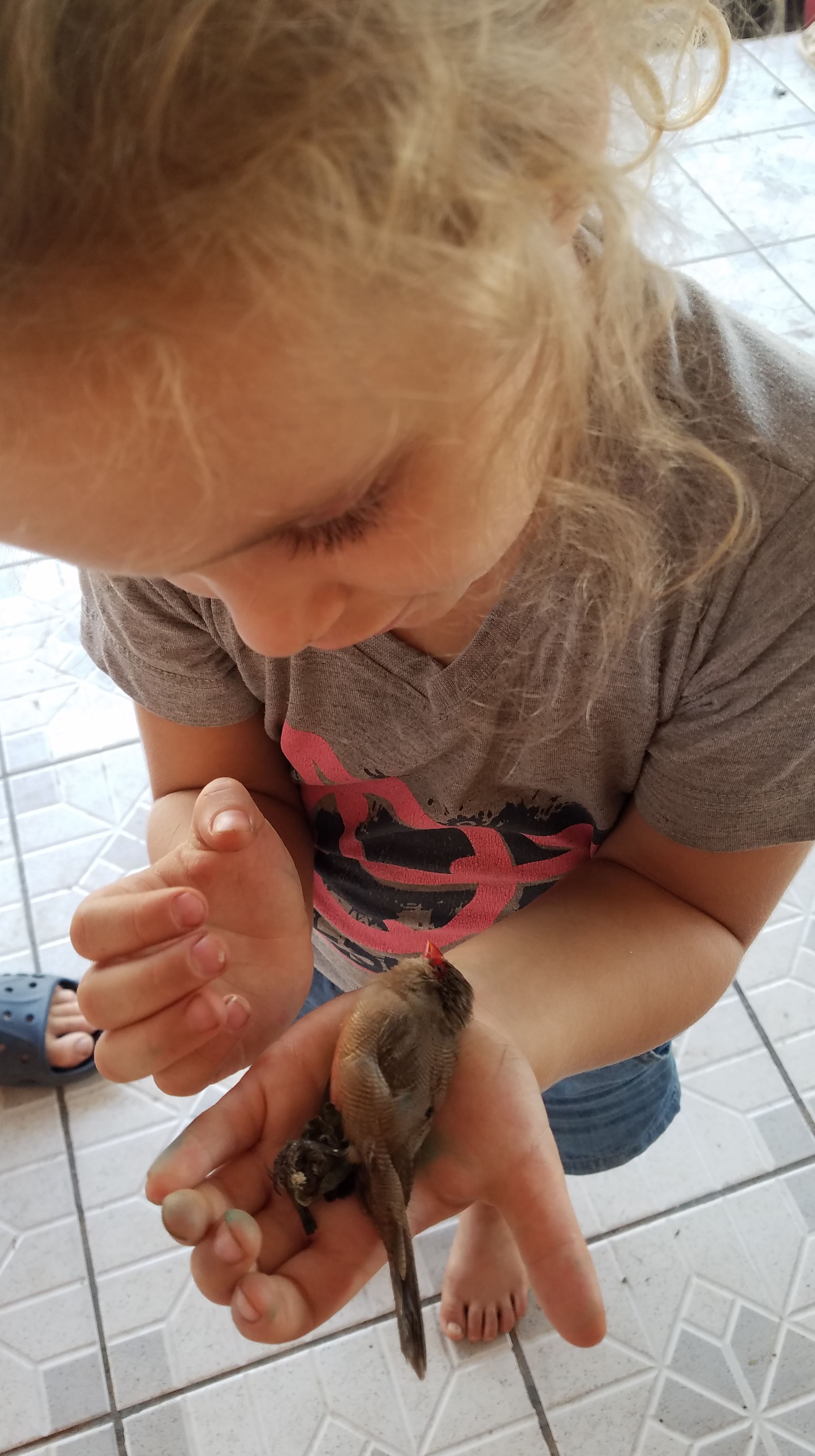 We scooped him up and gave him a stroller ride back to our house. Miriam was determined to doctor him back to health. We fixed him a little nest in a plastic pot. Miriam filled it with handfuls of grass.