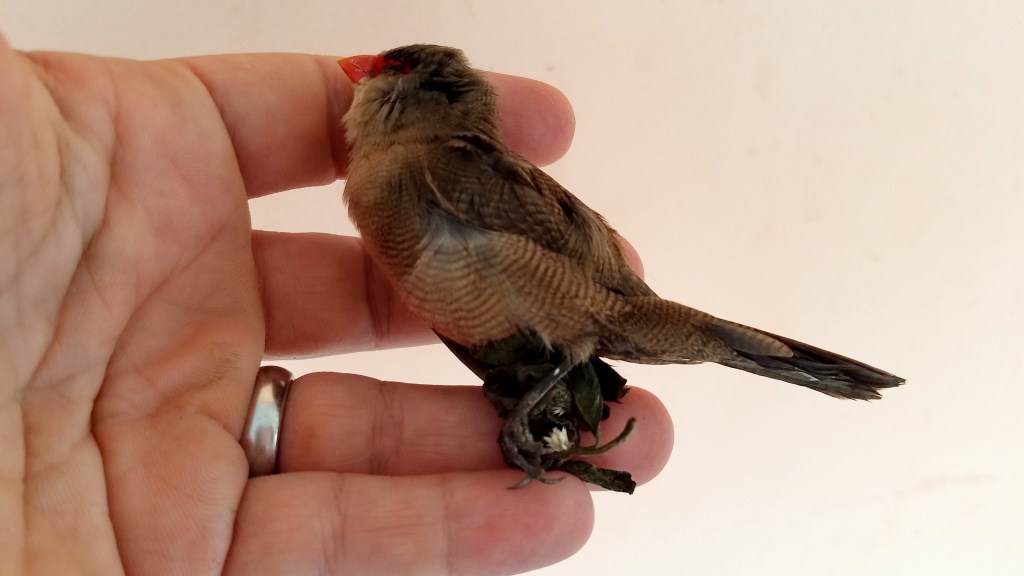 Today, as we were crossing a street to walk by the praça and then head home, we saw little brown dot on the white expanse of hot sidewalk. (It was 9:30 and already in the mid 90s.) It was a little finch. This species, a common waxbill, is not native to Brazil but people keep them as pets, and use them in the goldmines. There has come to be a wild population here, though. This little finch was not in a good way.
