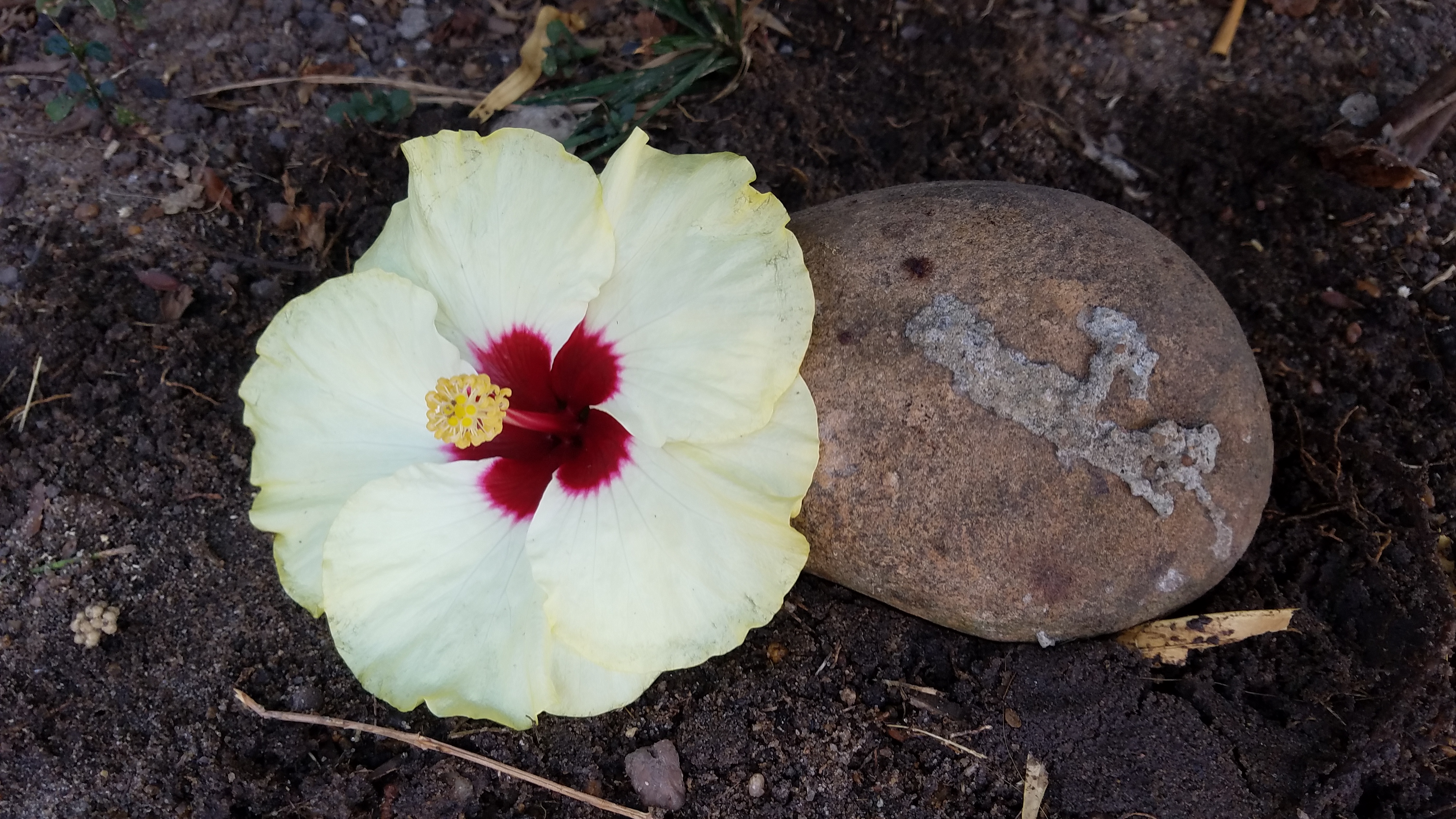 I told Miriam, and we found a spot to bury him in the shade under one of our palm trees. I had to wet the ground in order to dig a little hole because it is the dry season, and the dirt is as hard as concrete. I asked Miriam if she wanted to name the bird before we buried him. She decided on Fred. We laid Fred in the hole, and Miriam said a little prayer while I put the dirt back in. We put a rock over the grave to deter the dogs, and one of our hibiscus blooms to celebrate Fred’s little life.